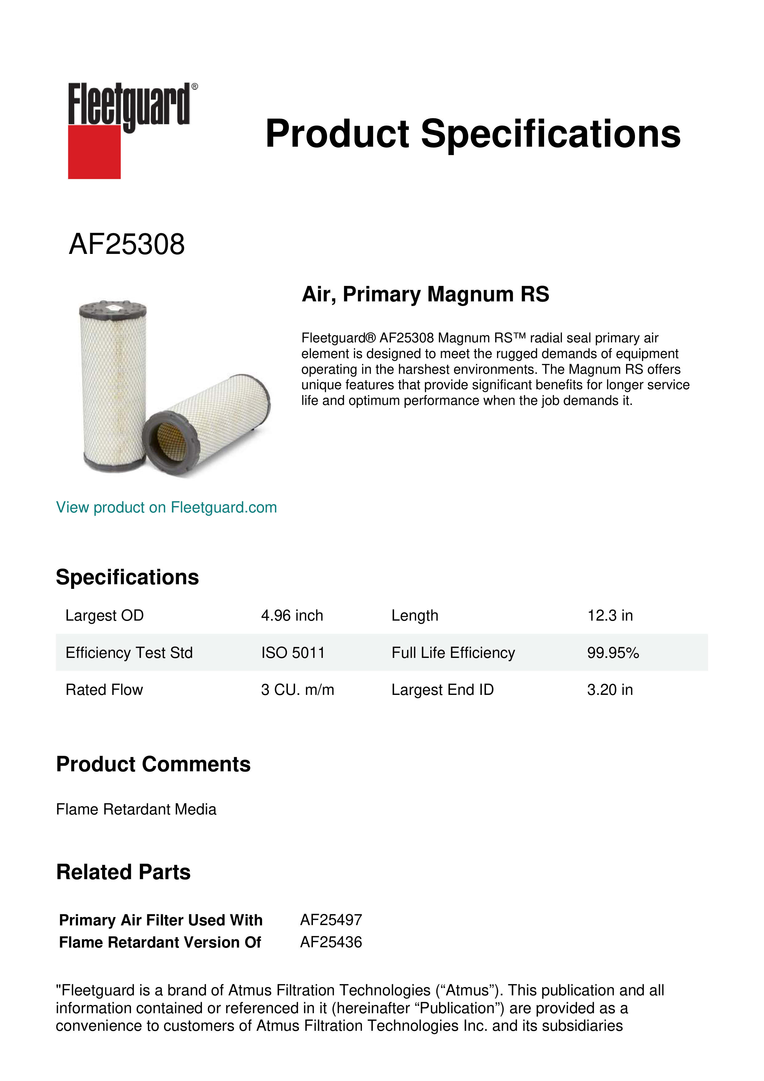 Fleetguard® AF25308 Magnum RS™ radial seal primary air element is designed to meet the rugged demands of equipment operating in the harshest environments. The Magnum RS offers unique features that provide significant benefits for longer service life and optimum performance when the job demands it.Specification
