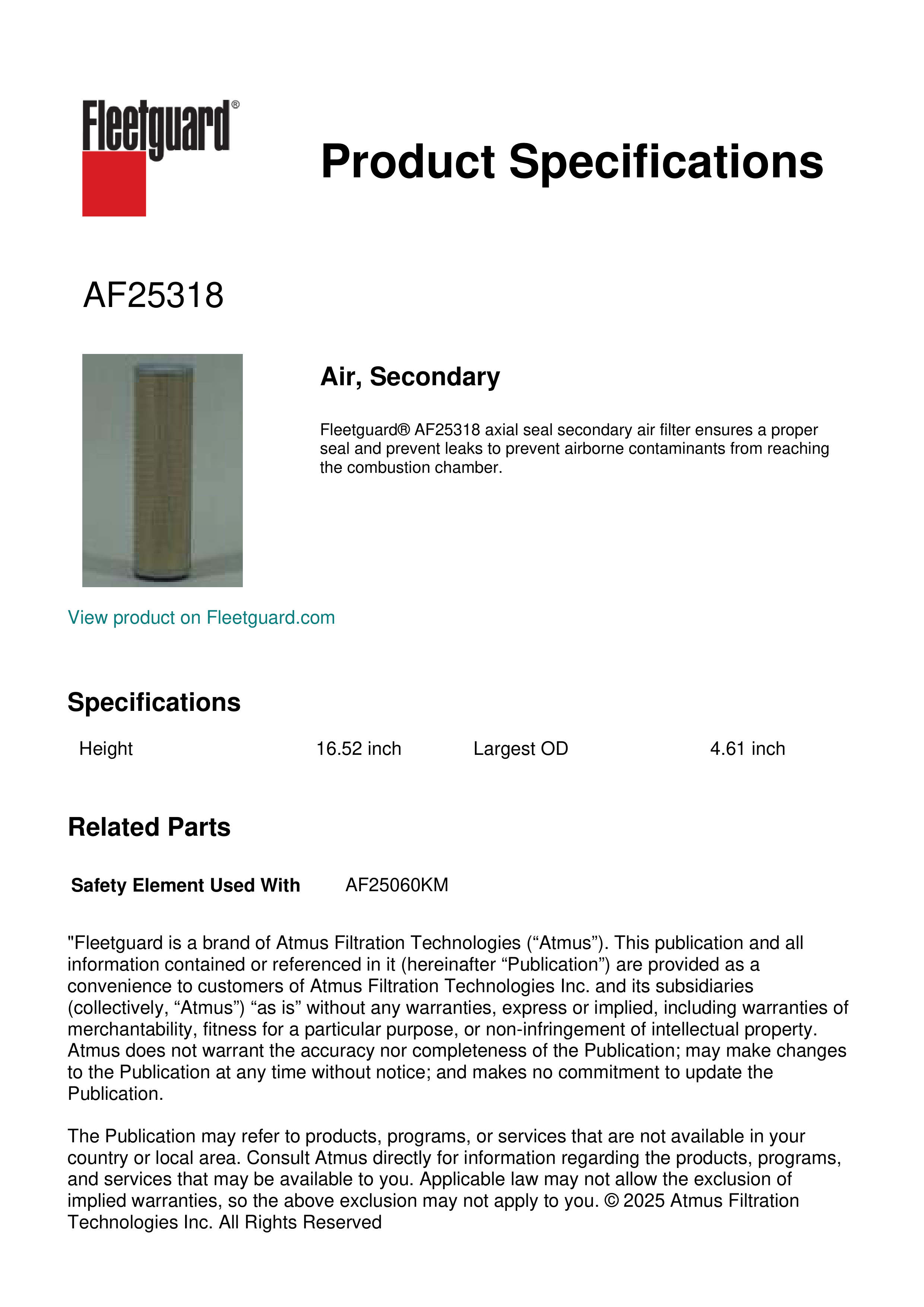 Fleetguard® AF25318 axial seal secondary air filter ensures a proper seal and prevent leaks to prevent airborne contaminants from reaching the combustion chamber.