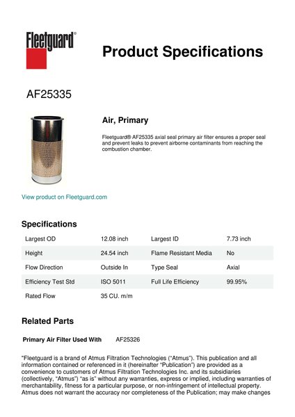 Fleetguard® AF25335 axial seal primary air filter ensures a proper seal and prevent leaks to prevent airborne contaminants from reaching the combustion chamber.