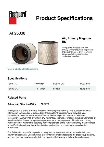 Fleetguard® AF25338 axial seal primary air filter ensures a proper seal and prevent leaks to prevent airborne contaminants from reaching the combustion chamber.