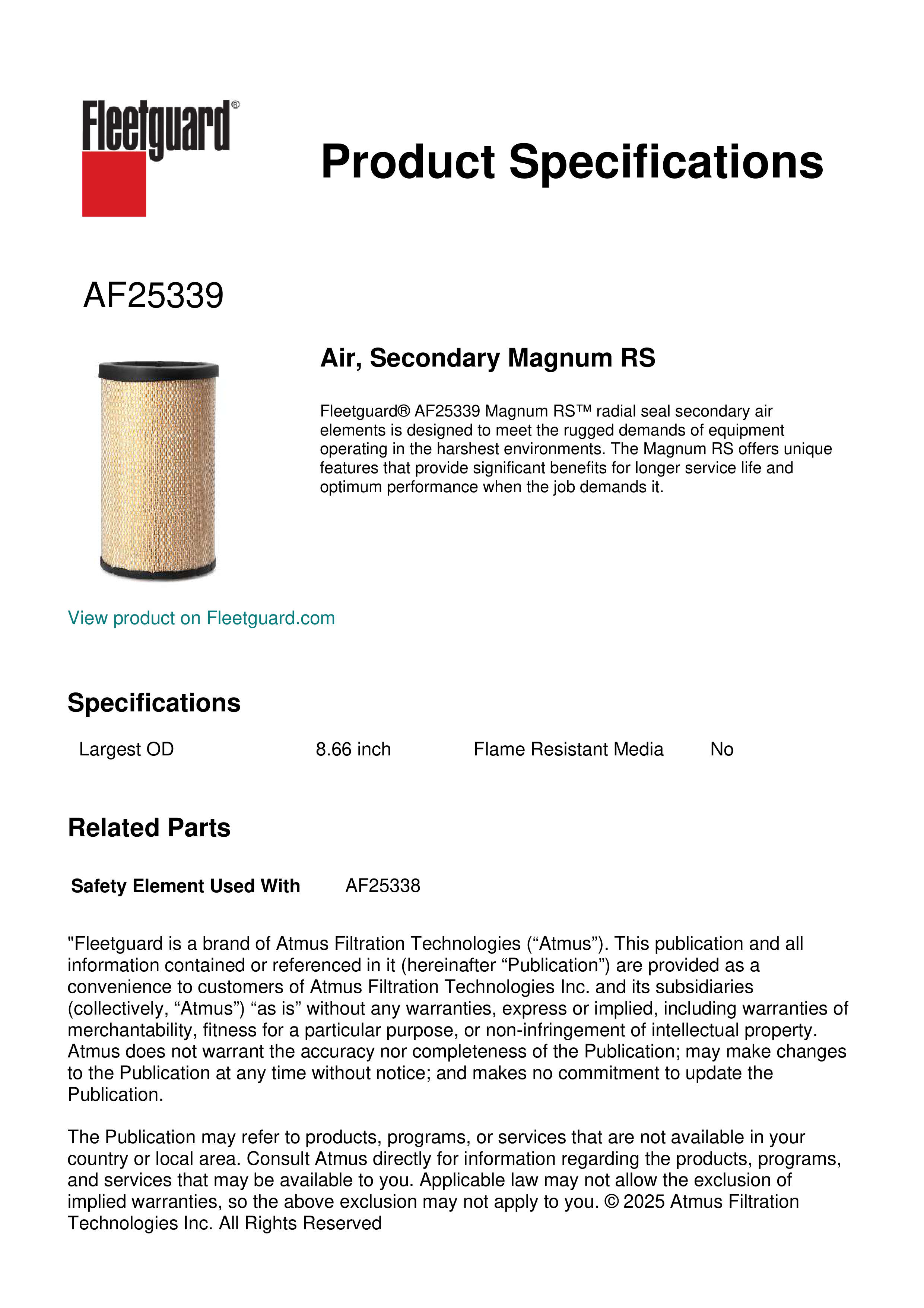 Fleetguard® AF25339 Magnum RS™ radial seal secondary air elements is designed to meet the rugged demands of equipment operating in the harshest environments. The Magnum RS offers unique features that provide significant benefits for longer service life and optimum performance when the job demands it.Specification
