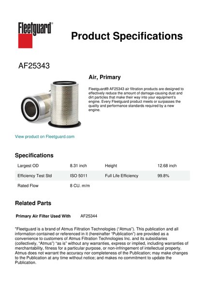 Fleetguard® AF25343 air filtration products are designed to effectively reduce the amount of damage-causing dust and dirt particles that make their way into your equipment’s engine. Every Fleetguard product meets or surpasses the quality and performance standards required by a new engine.Specification