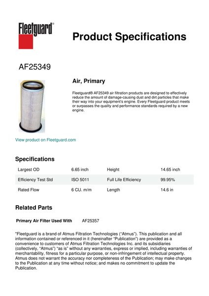 Fleetguard® AF25349 air filtration products are designed to effectively reduce the amount of damage-causing dust and dirt particles that make their way into your equipment’s engine. Every Fleetguard product meets or surpasses the quality and performance standards required by a new engine.Specification