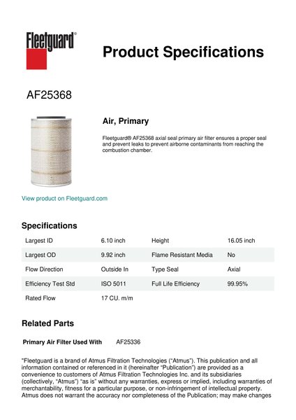 Fleetguard® AF25368 axial seal primary air filter ensures a proper seal and prevent leaks to prevent airborne contaminants from reaching the combustion chamber.