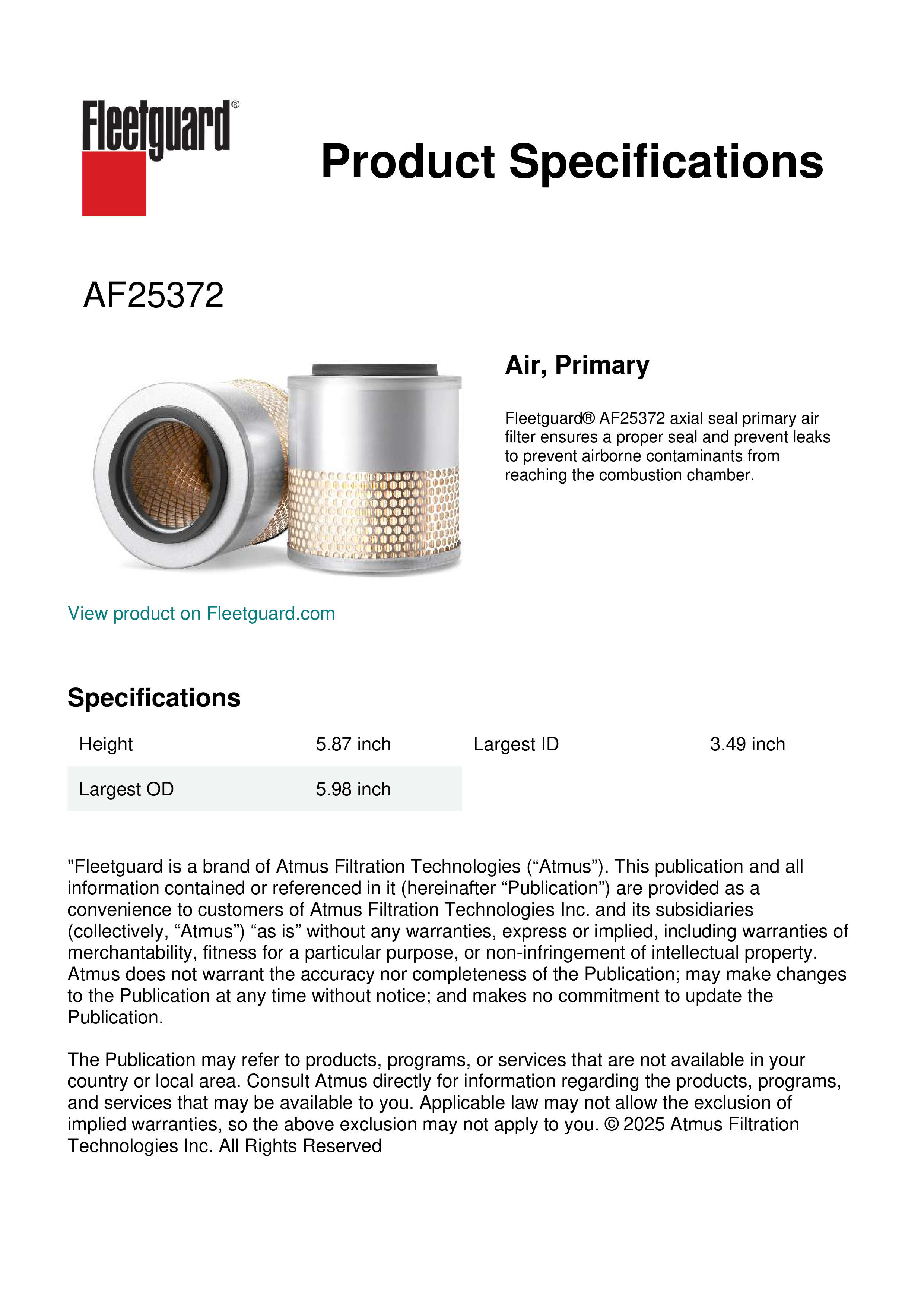 Fleetguard® AF25372 axial seal primary air filter ensures a proper seal and prevent leaks to prevent airborne contaminants from reaching the combustion chamber.