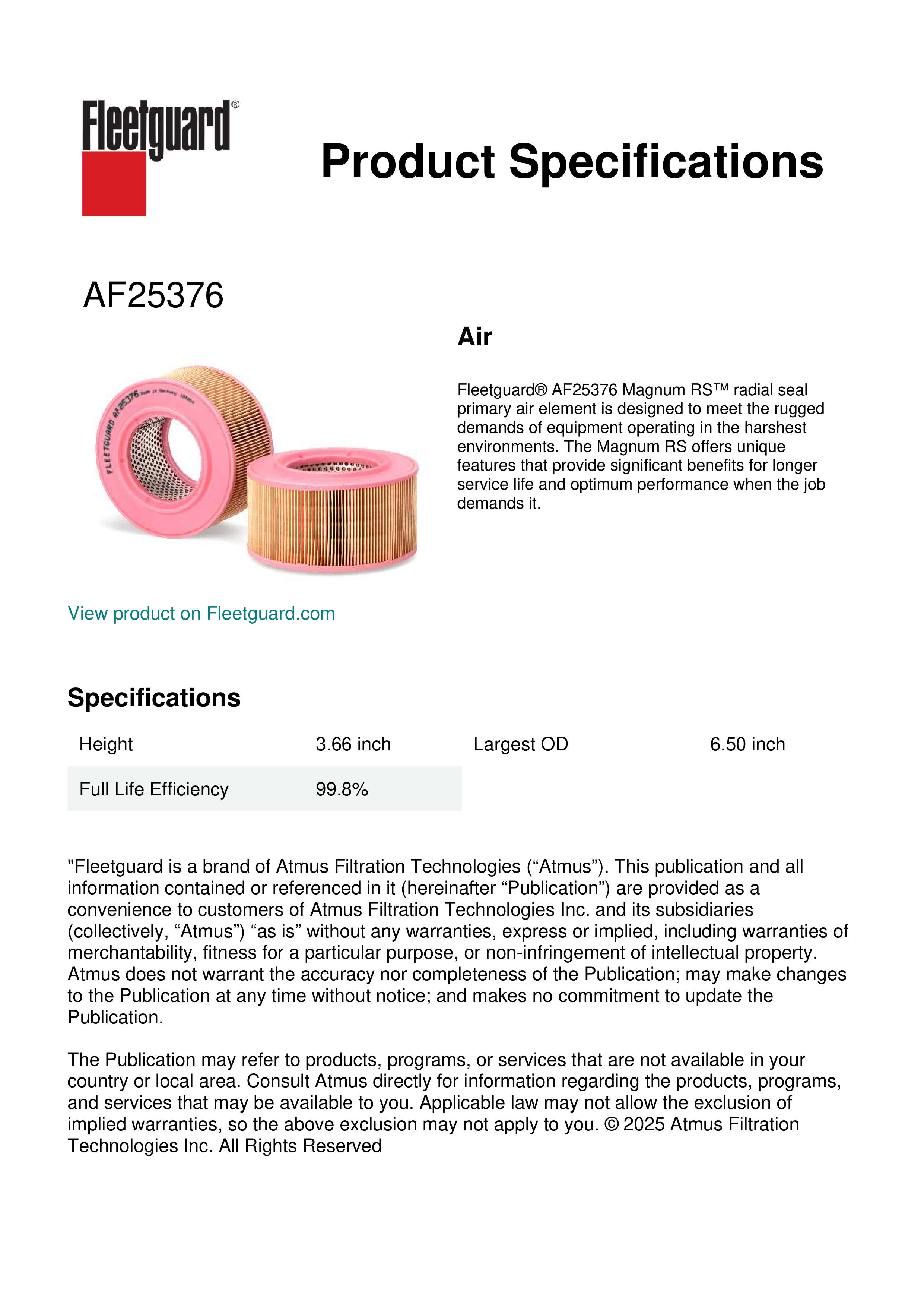 Fleetguard® AF25376 Magnum RS™ radial seal primary air element is designed to meet the rugged demands of equipment operating in the harshest environments. The Magnum RS offers unique features that provide significant benefits for longer service life and optimum performance when the job demands it.Specification