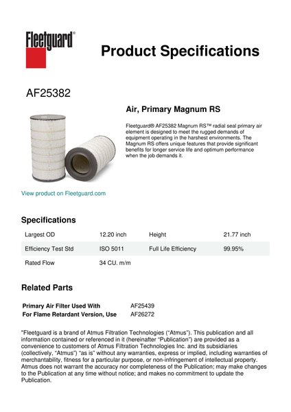 Fleetguard® AF25382 Magnum RS™ radial seal primary air element is designed to meet the rugged demands of equipment operating in the harshest environments. The Magnum RS offers unique features that provide significant benefits for longer service life and optimum performance when the job demands it.Specification