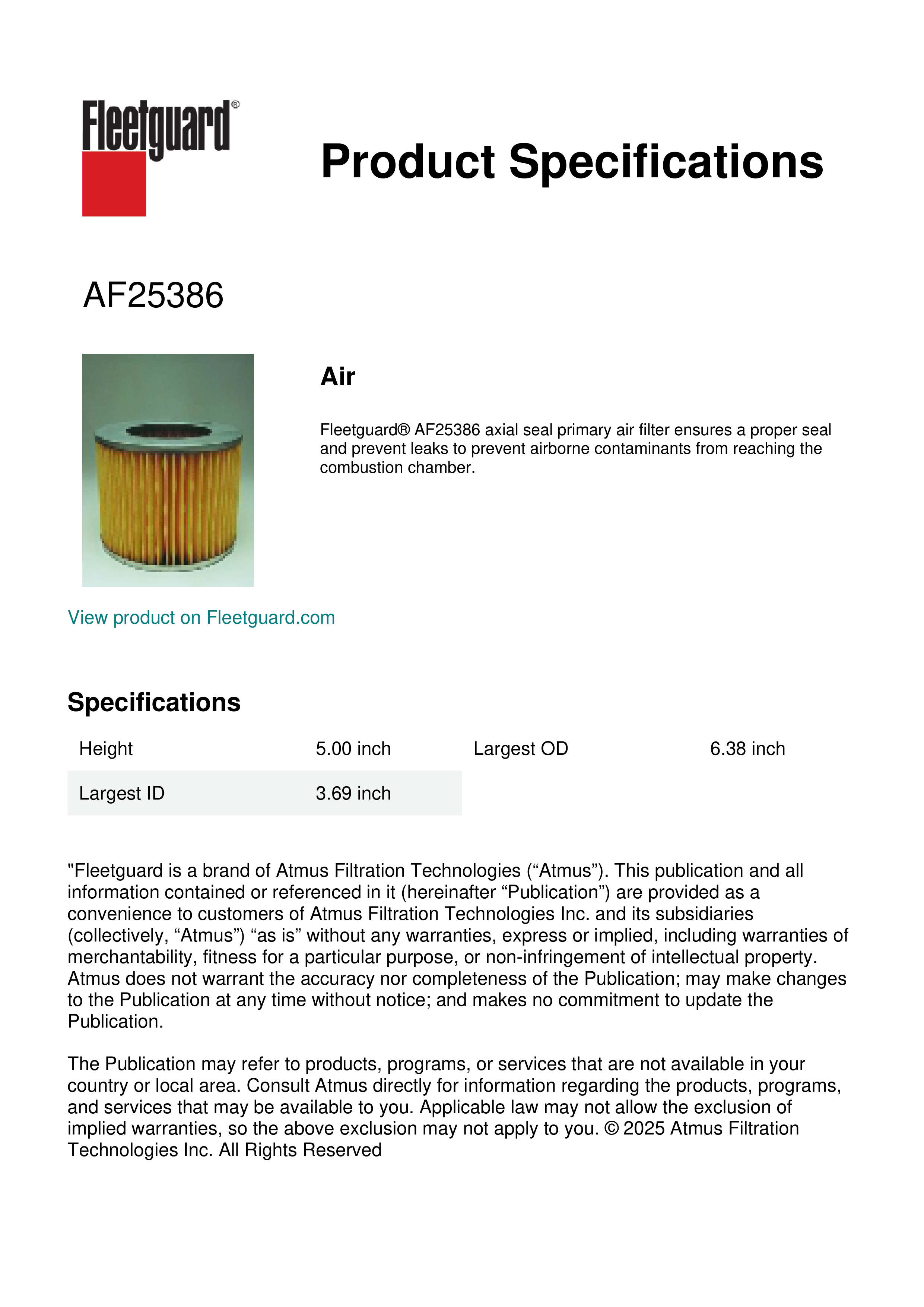 Fleetguard® AF25386 axial seal primary air filter ensures a proper seal and prevent leaks to prevent airborne contaminants from reaching the combustion chamber.