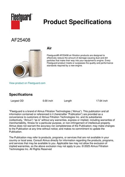 Fleetguard® AF25408 air filtration products are designed to effectively reduce the amount of damage-causing dust and dirt particles that make their way into your equipment’s engine. Every Fleetguard product meets or surpasses the quality and performance standards required by a new engine.Specification