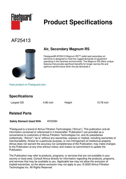 Fleetguard® AF25413 Magnum RS™ radial seal secondary air elements is designed to meet the rugged demands of equipment operating in the harshest environments. The Magnum RS offers unique features that provide significant benefits for longer service life and optimum performance when the job demands it.