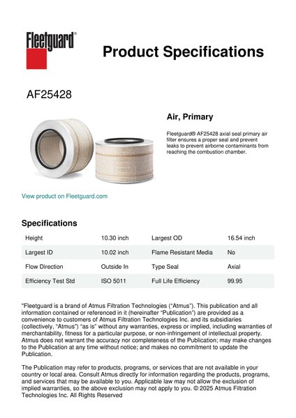 Fleetguard® AF25428 axial seal primary air filter ensures a proper seal and prevent leaks to prevent airborne contaminants from reaching the combustion chamber.