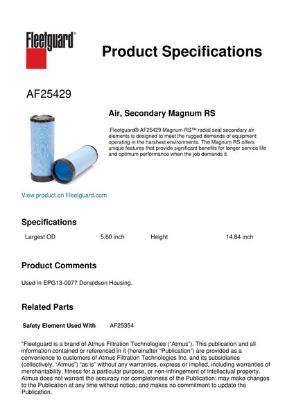 .Fleetguard® AF25429 Magnum RS™ radial seal secondary air elements is designed to meet the rugged demands of equipment operating in the harshest environments. The Magnum RS offers unique features that provide significant benefits for longer service life and optimum performance when the job demands it.Specification