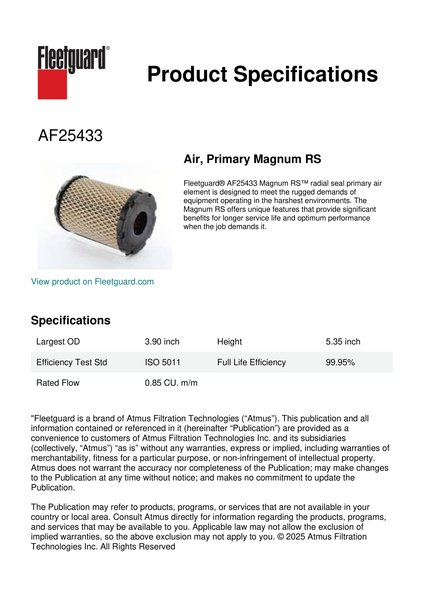 Fleetguard® AF25433 Magnum RS™ radial seal primary air element is designed to meet the rugged demands of equipment operating in the harshest environments. The Magnum RS offers unique features that provide significant benefits for longer service life and optimum performance when the job demands it.