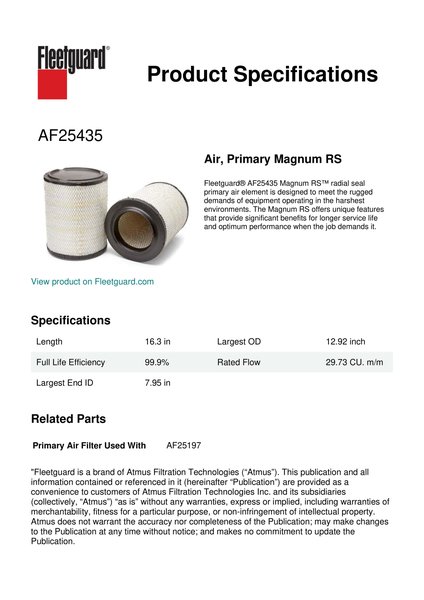 Fleetguard® AF25435 Magnum RS™ radial seal primary air element is designed to meet the rugged demands of equipment operating in the harshest environments. The Magnum RS offers unique features that provide significant benefits for longer service life and optimum performance when the job demands it.