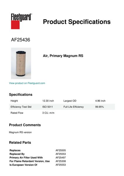 Fleetguard AF25436 Replacement Air, Primary Magnum Rs