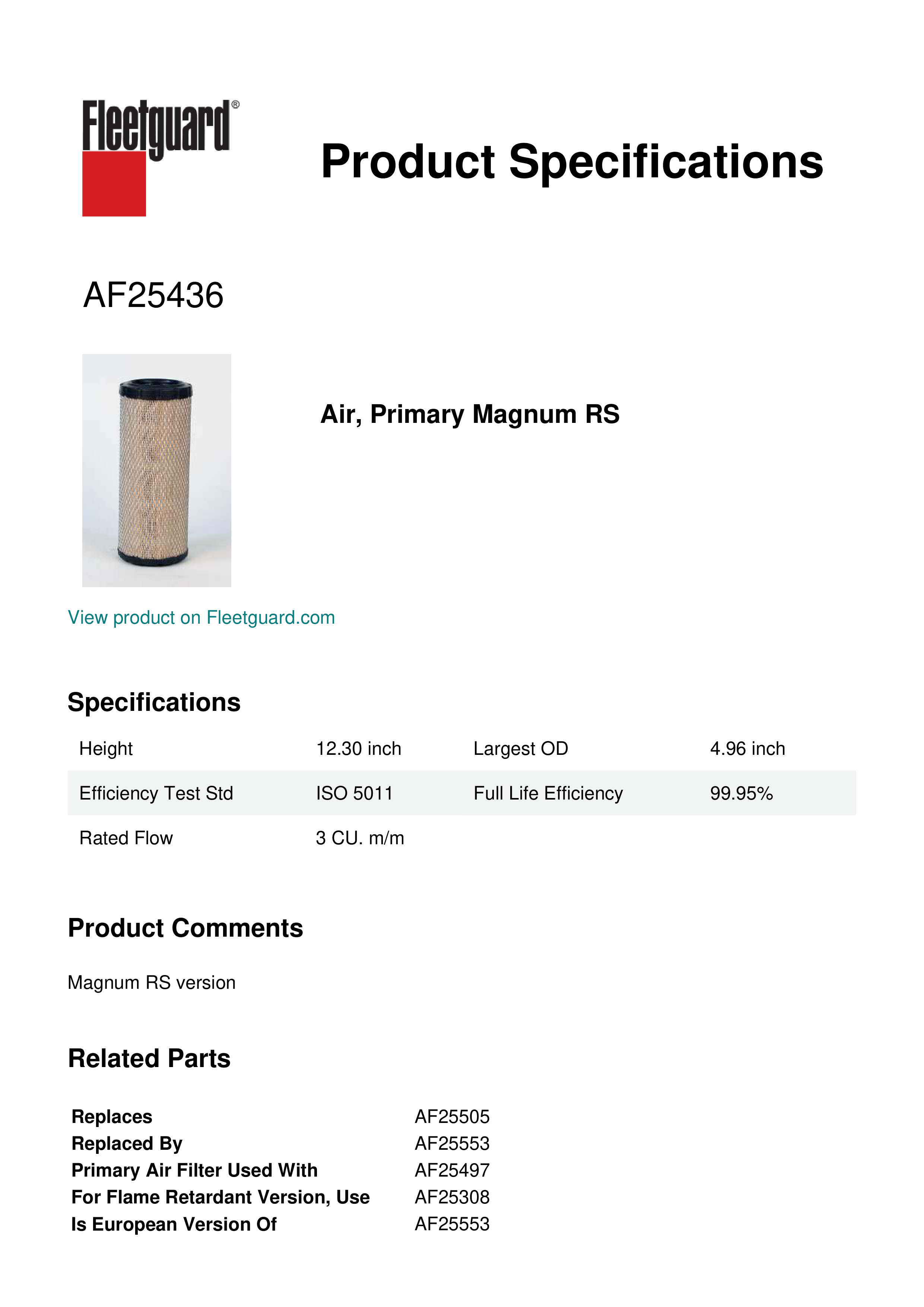 Fleetguard® AF25436 spin-on lube filter meets or exceeds OE performance requirements and the new challenges of modern engine technology.Specification