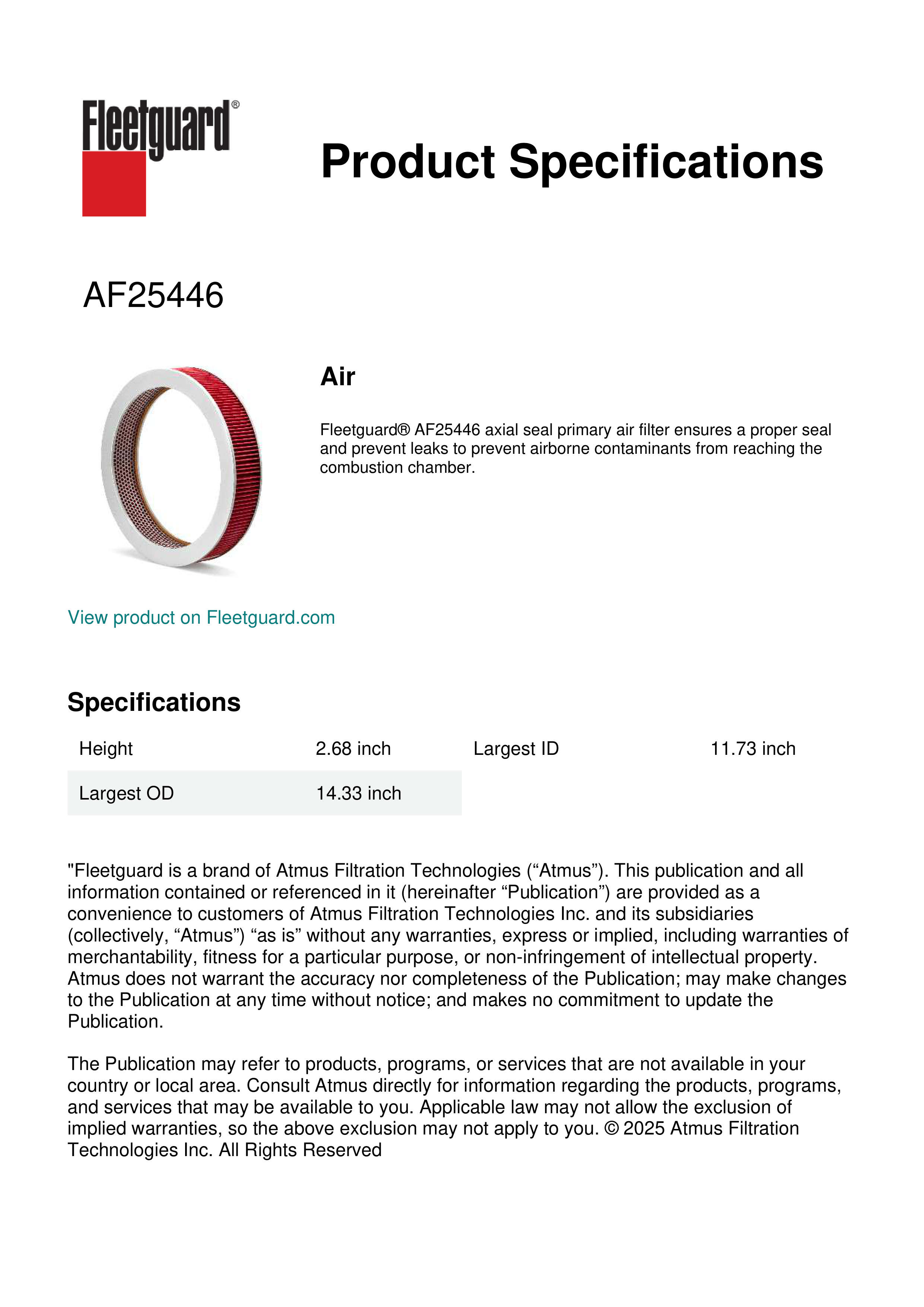 Fleetguard® AF25446 axial seal primary air filter ensures a proper seal and prevent leaks to prevent airborne contaminants from reaching the combustion chamber.Specification