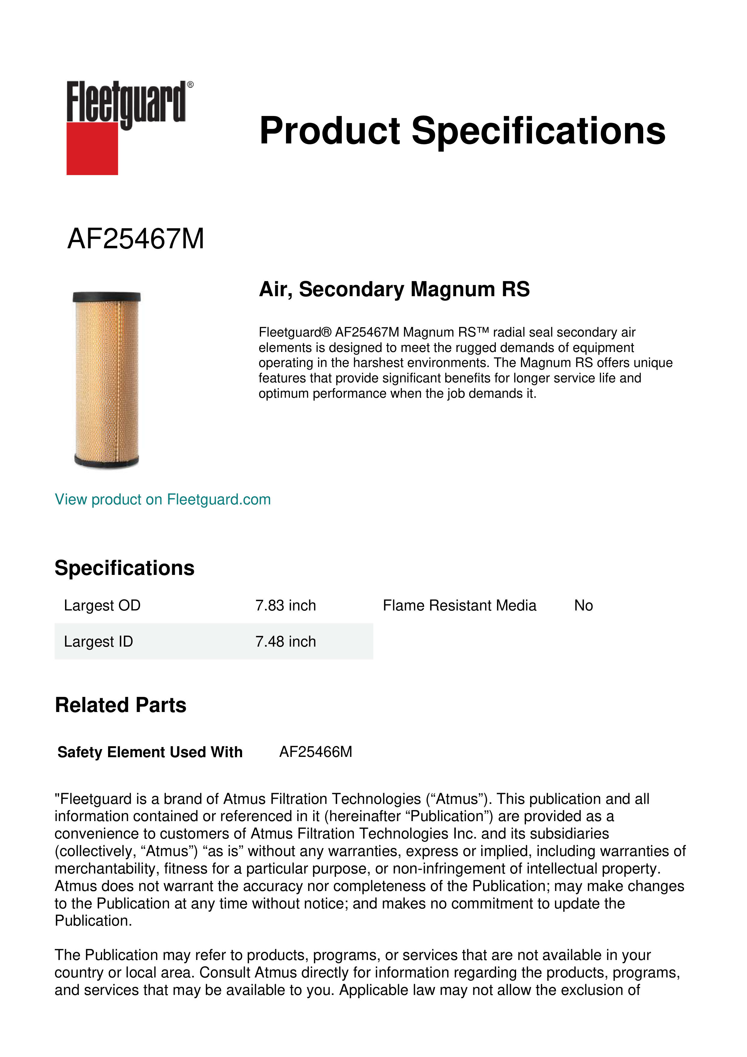 Fleetguard® AF25467M Magnum RS™ radial seal secondary air elements is designed to meet the rugged demands of equipment operating in the harshest environments. The Magnum RS offers unique features that provide significant benefits for longer service life and optimum performance when the job demands it.Specification