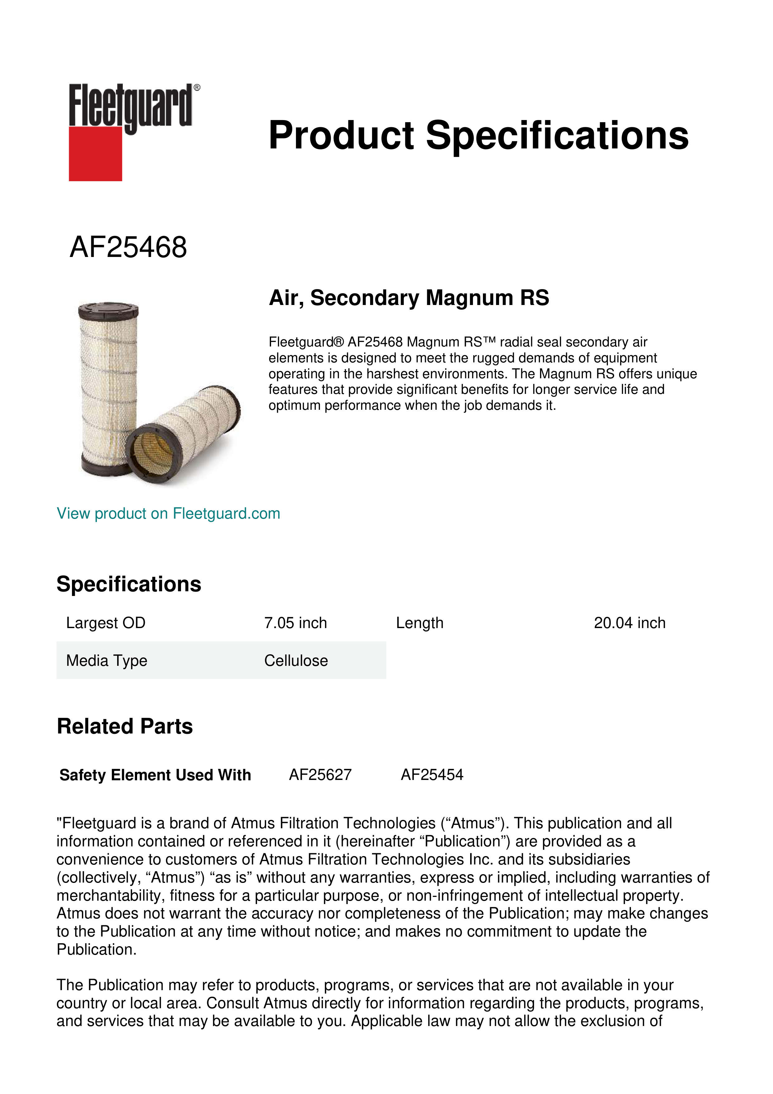 Fleetguard® AF25468 Magnum RS™ radial seal secondary air elements is designed to meet the rugged demands of equipment operating in the harshest environments. The Magnum RS offers unique features that provide significant benefits for longer service life and optimum performance when the job demands it.Specification