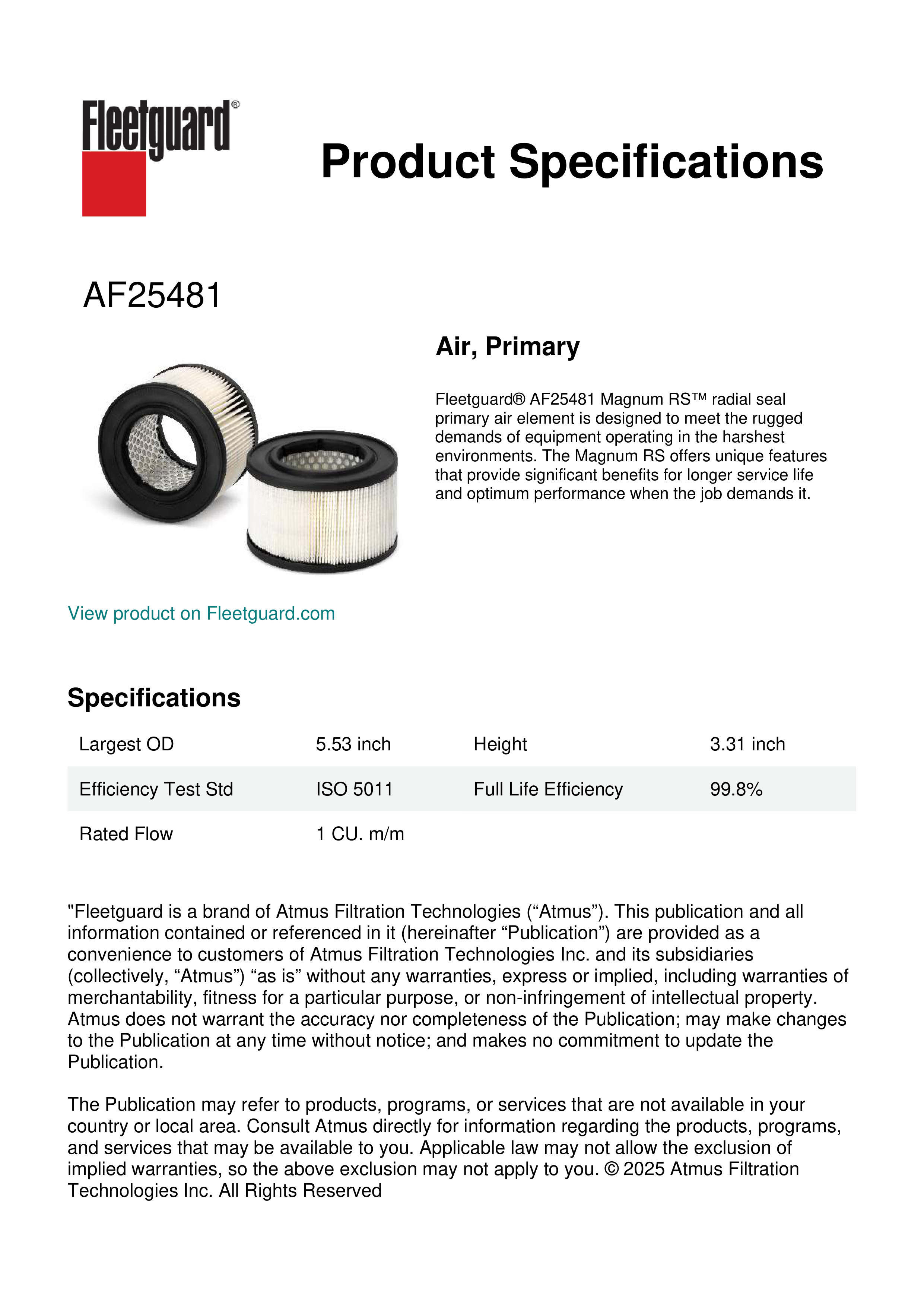 Fleetguard® AF25481 Magnum RS™ radial seal primary air element is designed to meet the rugged demands of equipment operating in the harshest environments. The Magnum RS offers unique features that provide significant benefits for longer service life and optimum performance when the job demands it.Specification