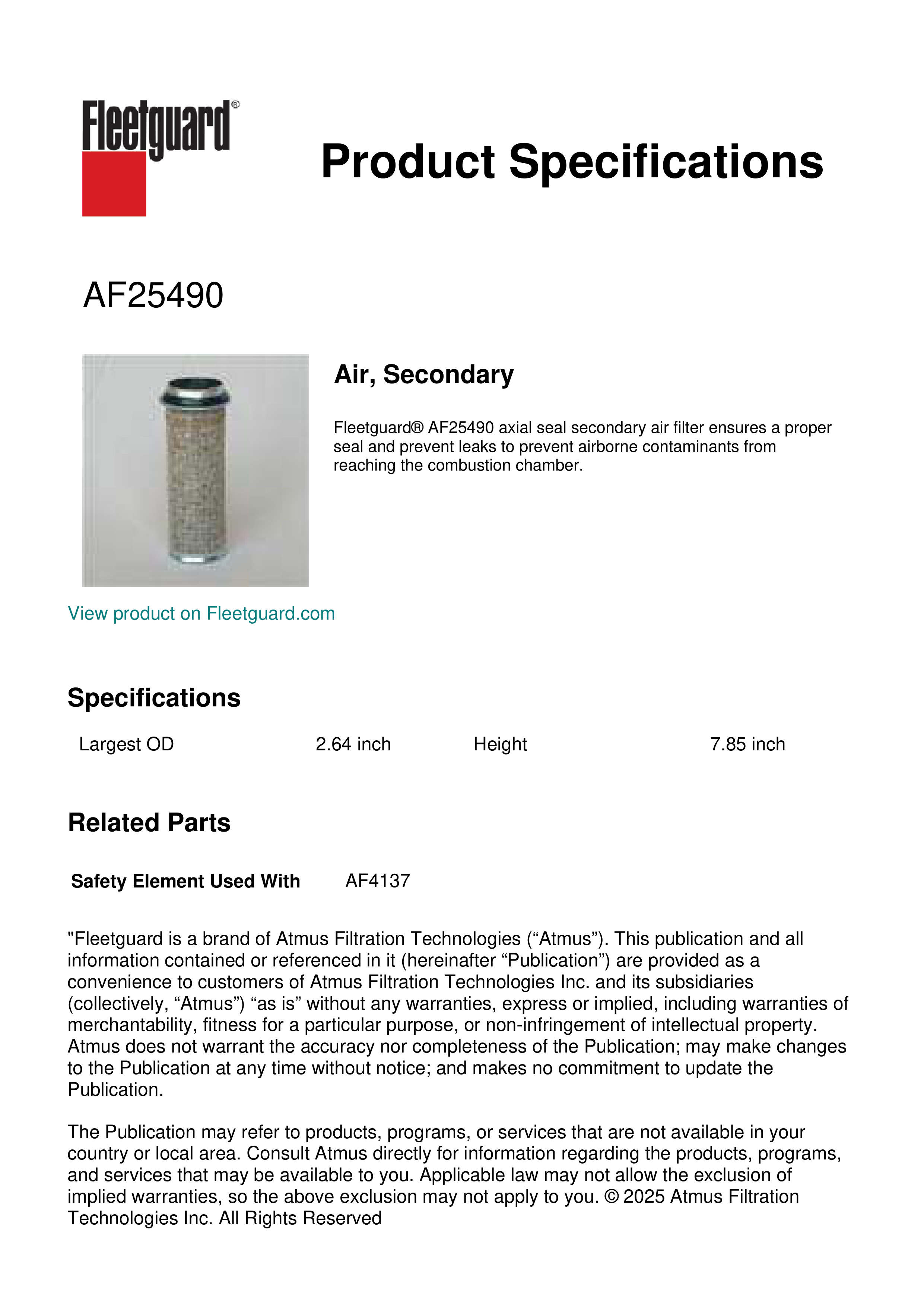Fleetguard AF25490 Air, Secondary