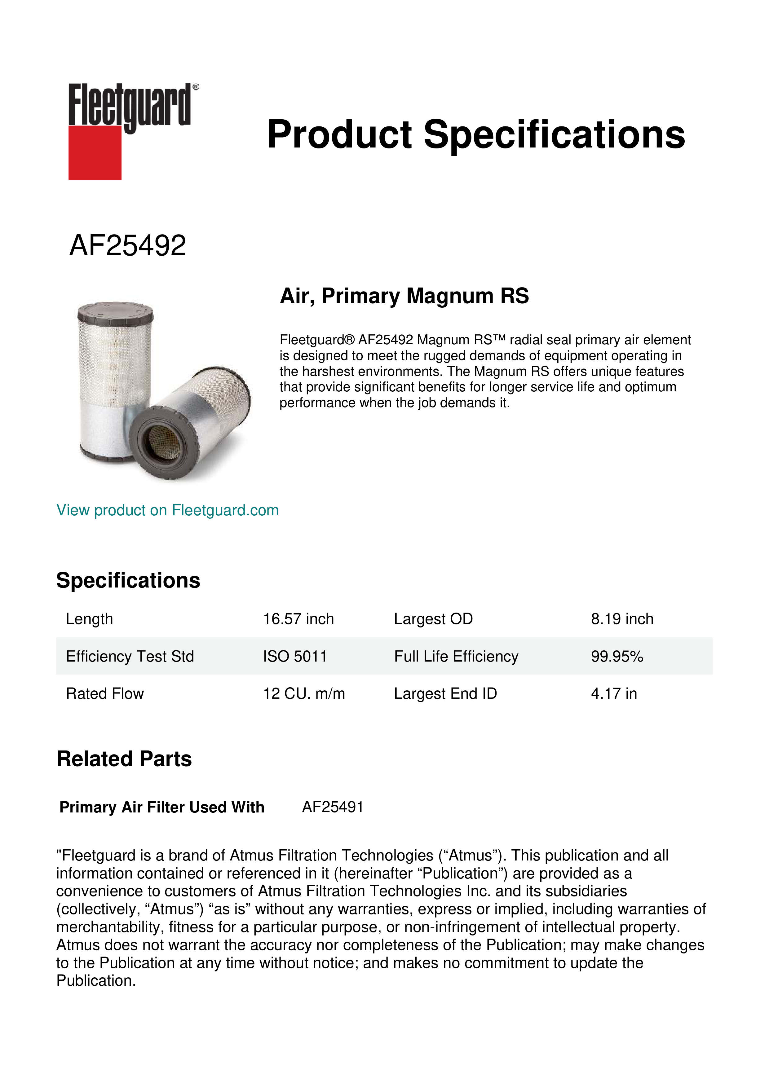 Fleetguard® AF25492 Magnum RS™ radial seal primary air element is designed to meet the rugged demands of equipment operating in the harshest environments. The Magnum RS offers unique features that provide significant benefits for longer service life and optimum performance when the job demands it.Specification