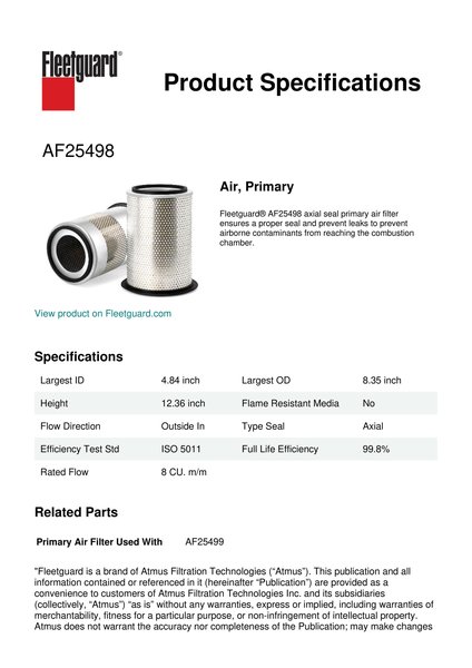 Fleetguard® AF25498 axial seal primary air filter ensures a proper seal and prevent leaks to prevent airborne contaminants from reaching the combustion chamber.