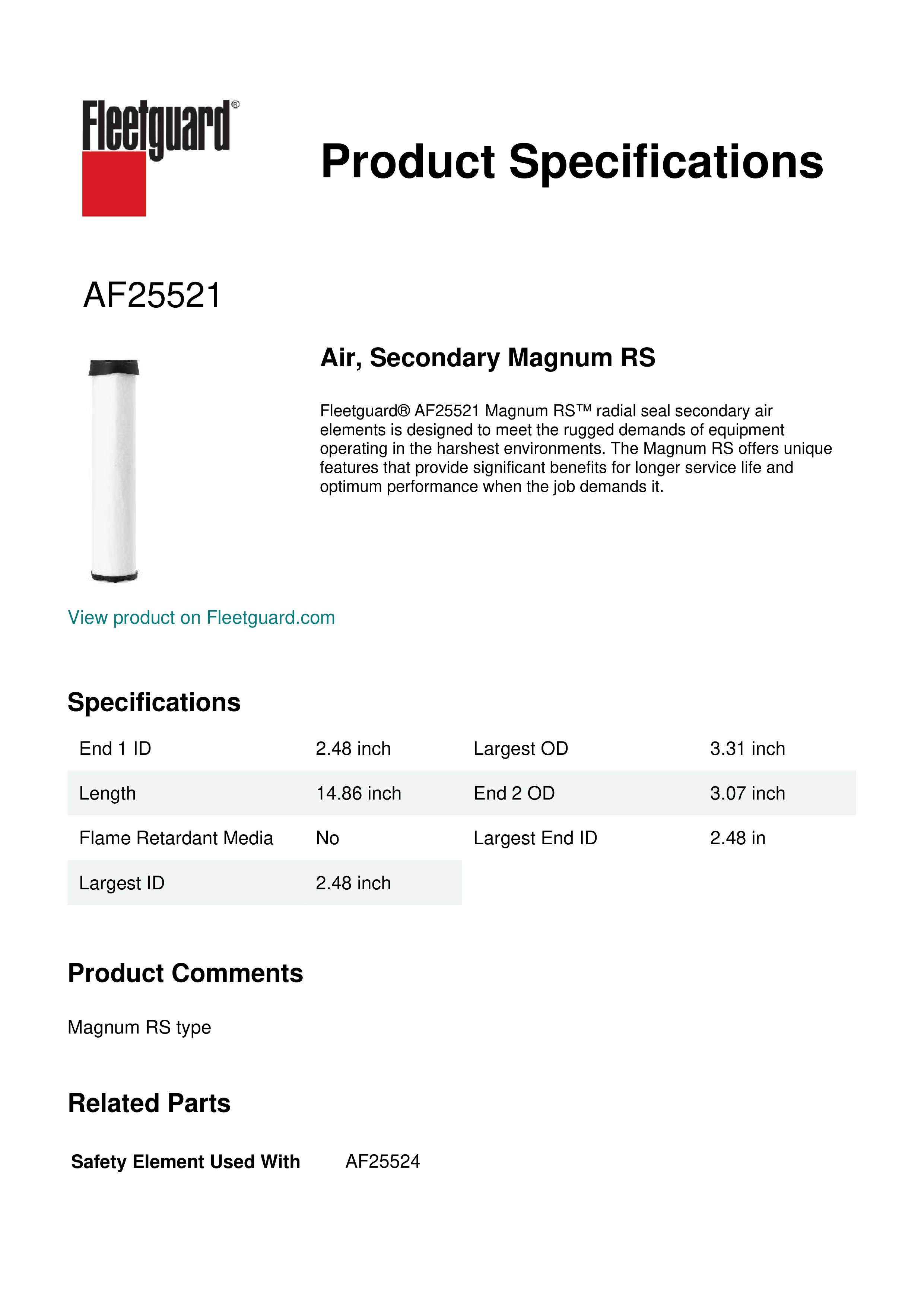 Fleetguard AF25521 Replacement Air, Secondary Magnum Rs
