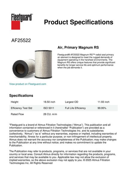 Fleetguard® AF25522 Magnum RS™ radial seal primary air element is designed to meet the rugged demands of equipment operating in the harshest environments. The Magnum RS offers unique features that provide significant benefits for longer service life and optimum performance when the job demands it.