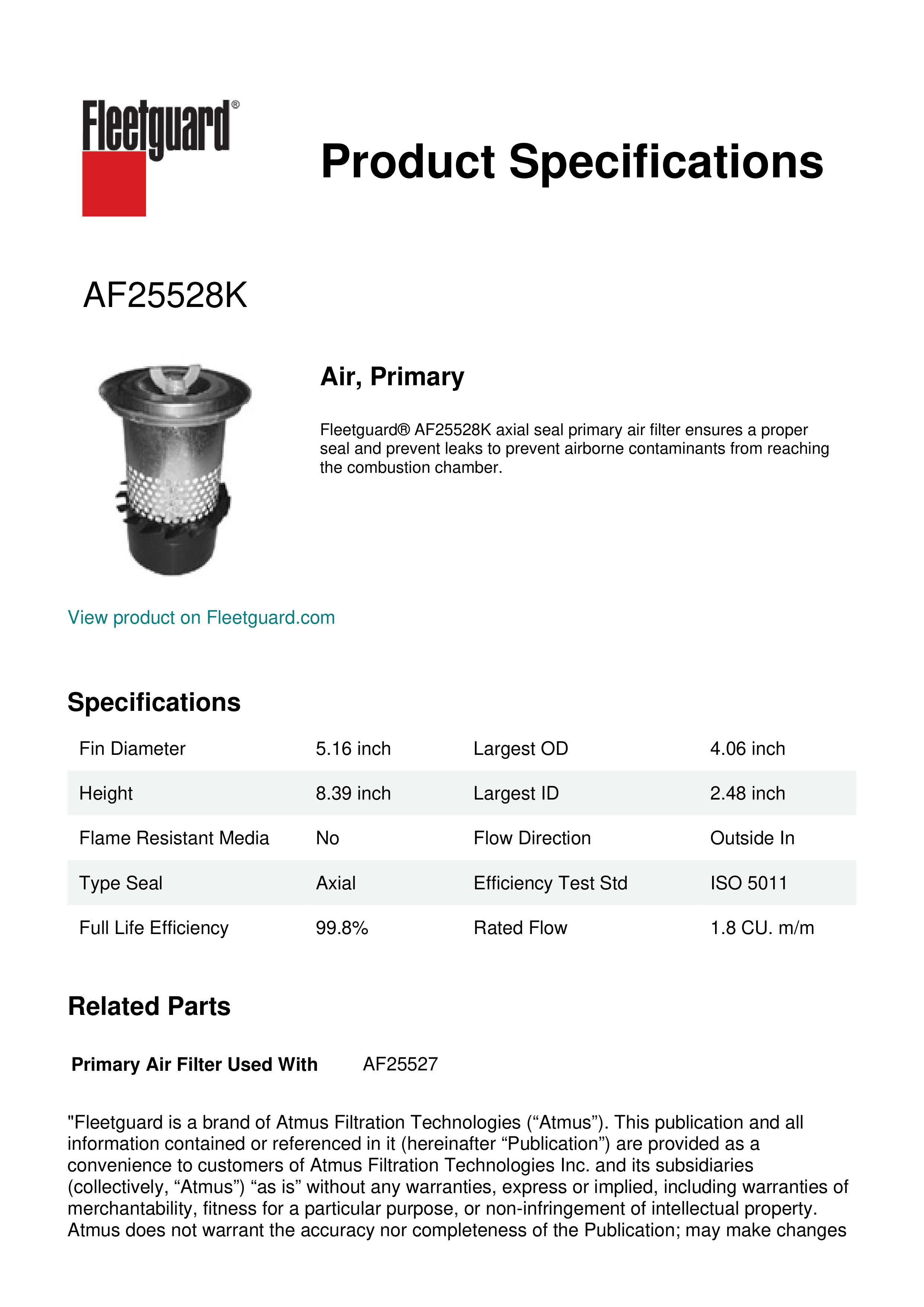 Fleetguard® AF25528K axial seal primary air filter ensures a proper seal and prevent leaks to prevent airborne contaminants from reaching the combustion chamber.Specification