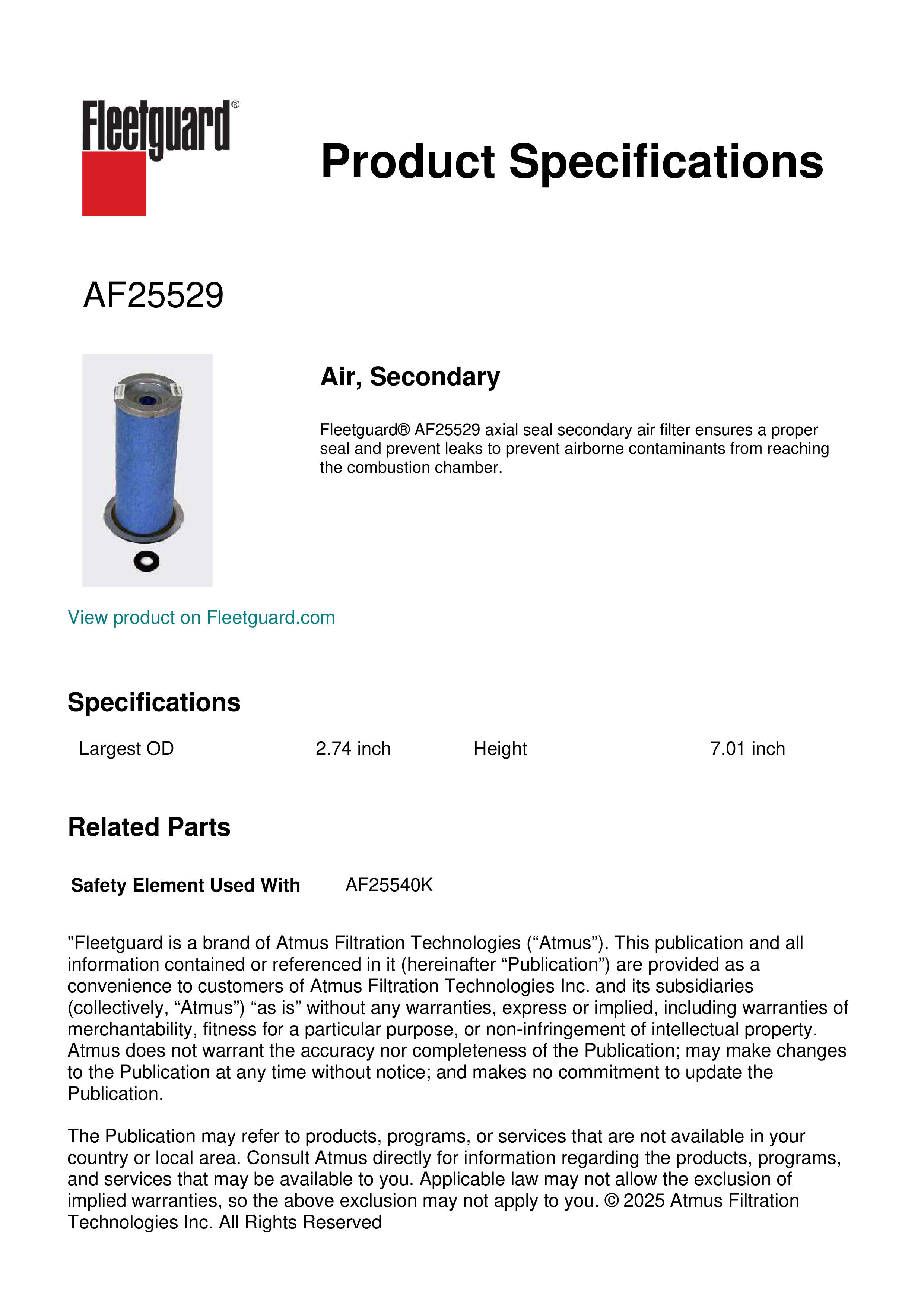 Fleetguard® AF25529 axial seal secondary air filter ensures a proper seal and prevent leaks to prevent airborne contaminants from reaching the combustion chamber.Specification