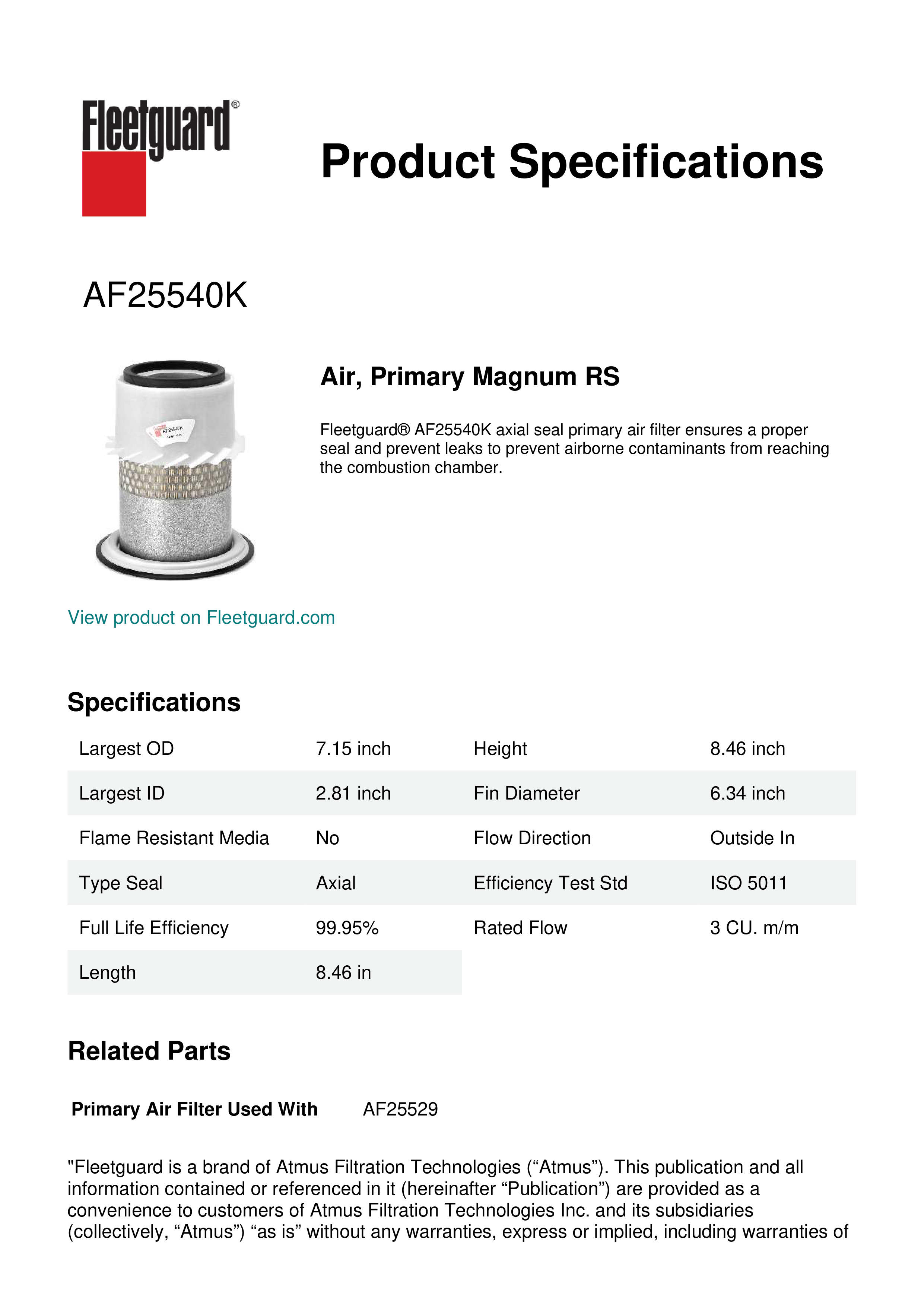 Fleetguard® AF25540K axial seal primary air filter ensures a proper seal and prevent leaks to prevent airborne contaminants from reaching the combustion chamber.Specification