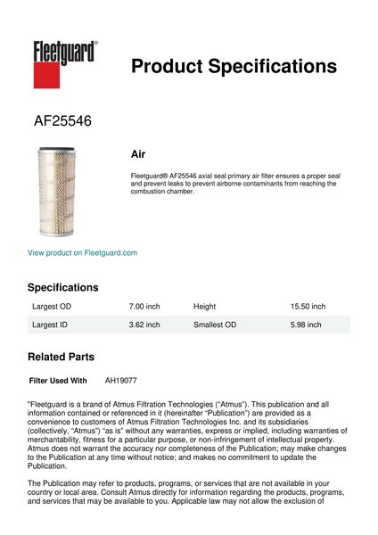 Fleetguard® AF25546 axial seal primary air filter ensures a proper seal and prevent leaks to prevent airborne contaminants from reaching the combustion chamber.