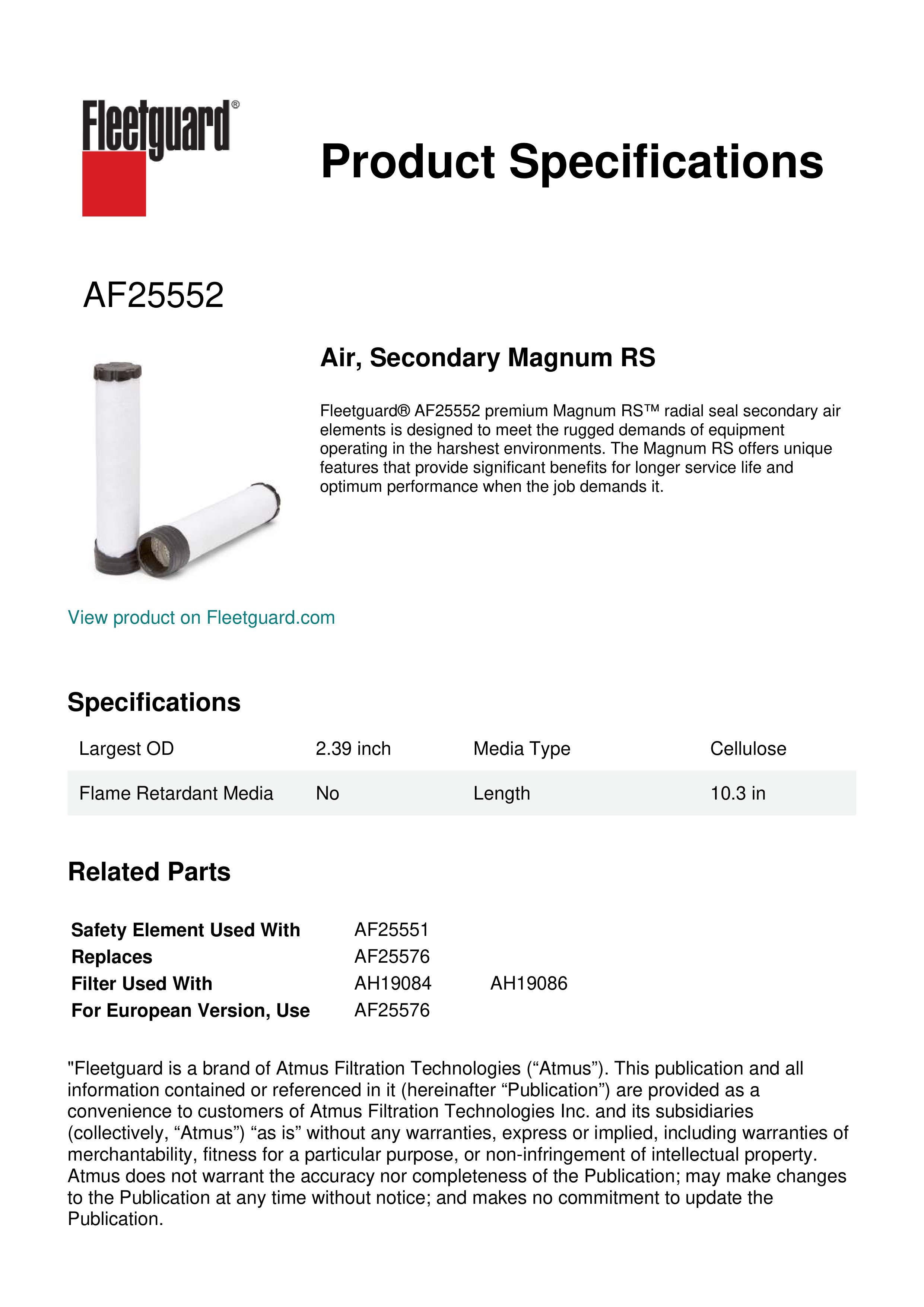 Fleetguard® AF25552 premium Magnum RS™ radial seal secondary air elements is designed to meet the rugged demands of equipment operating in the harshest environments. The Magnum RS offers unique features that provide significant benefits for longer service life and optimum performance when the job demands it.Specification