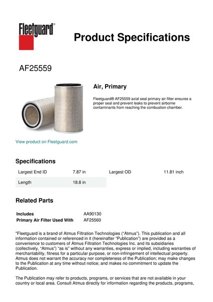 Fleetguard® AF25559 axial seal primary air filter ensures a proper seal and prevent leaks to prevent airborne contaminants from reaching the combustion chamber.
