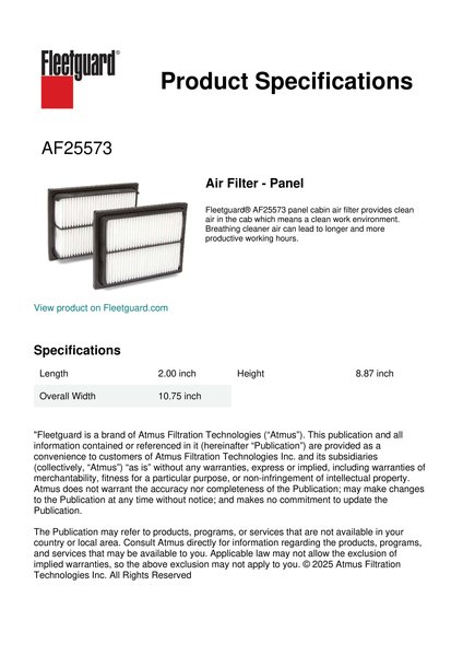Fleetguard® AF25573 panel cabin air filter provides clean air in the cab which means a clean work environment. Breathing cleaner air can lead to longer and more productive working hours.Specification