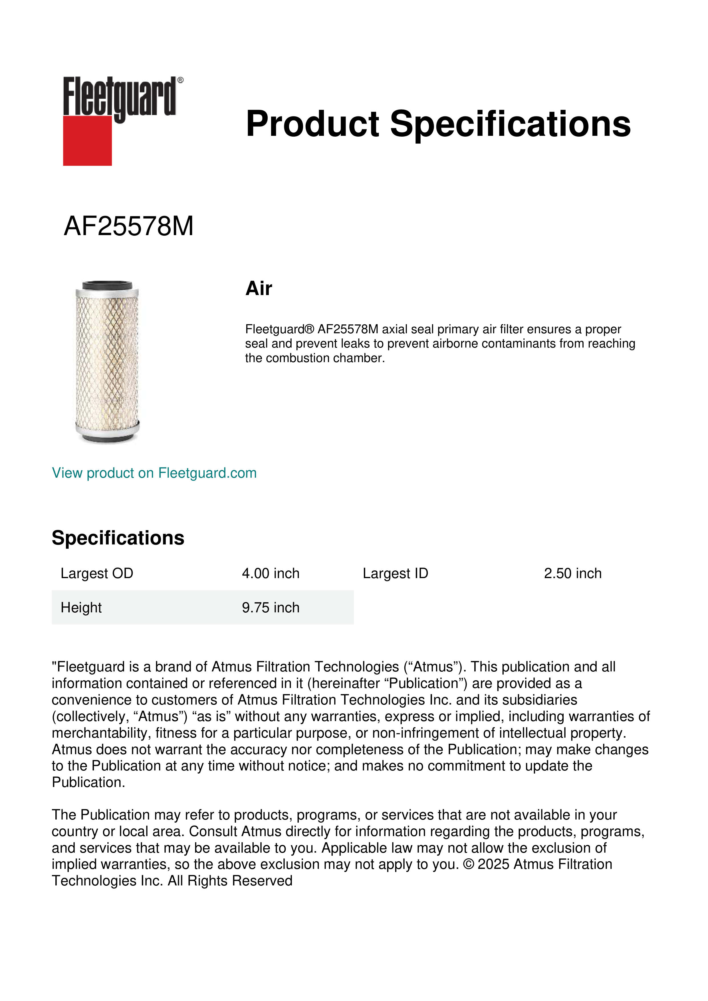 Fleetguard® AF25578M axial seal primary air filter ensures a proper seal and prevent leaks to prevent airborne contaminants from reaching the combustion chamber.Specification