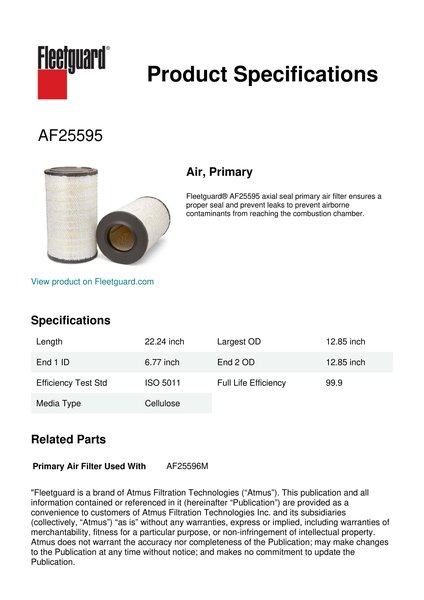 Fleetguard® AF25595 axial seal primary air filter ensures a proper seal and prevent leaks to prevent airborne contaminants from reaching the combustion chamber.