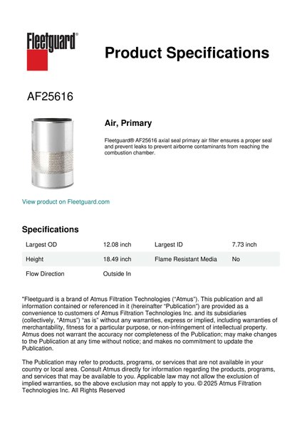 Fleetguard® AF25616 axial seal primary air filter ensures a proper seal and prevent leaks to prevent airborne contaminants from reaching the combustion chamber.