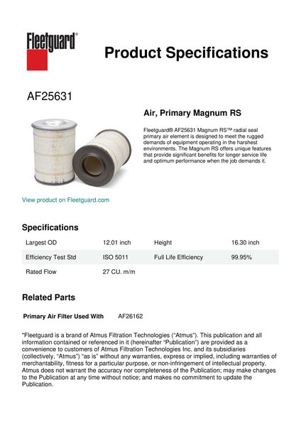 Fleetguard® AF25631 Magnum RS™ radial seal primary air element is designed to meet the rugged demands of equipment operating in the harshest environments. The Magnum RS offers unique features that provide significant benefits for longer service life and optimum performance when the job demands it.Specification