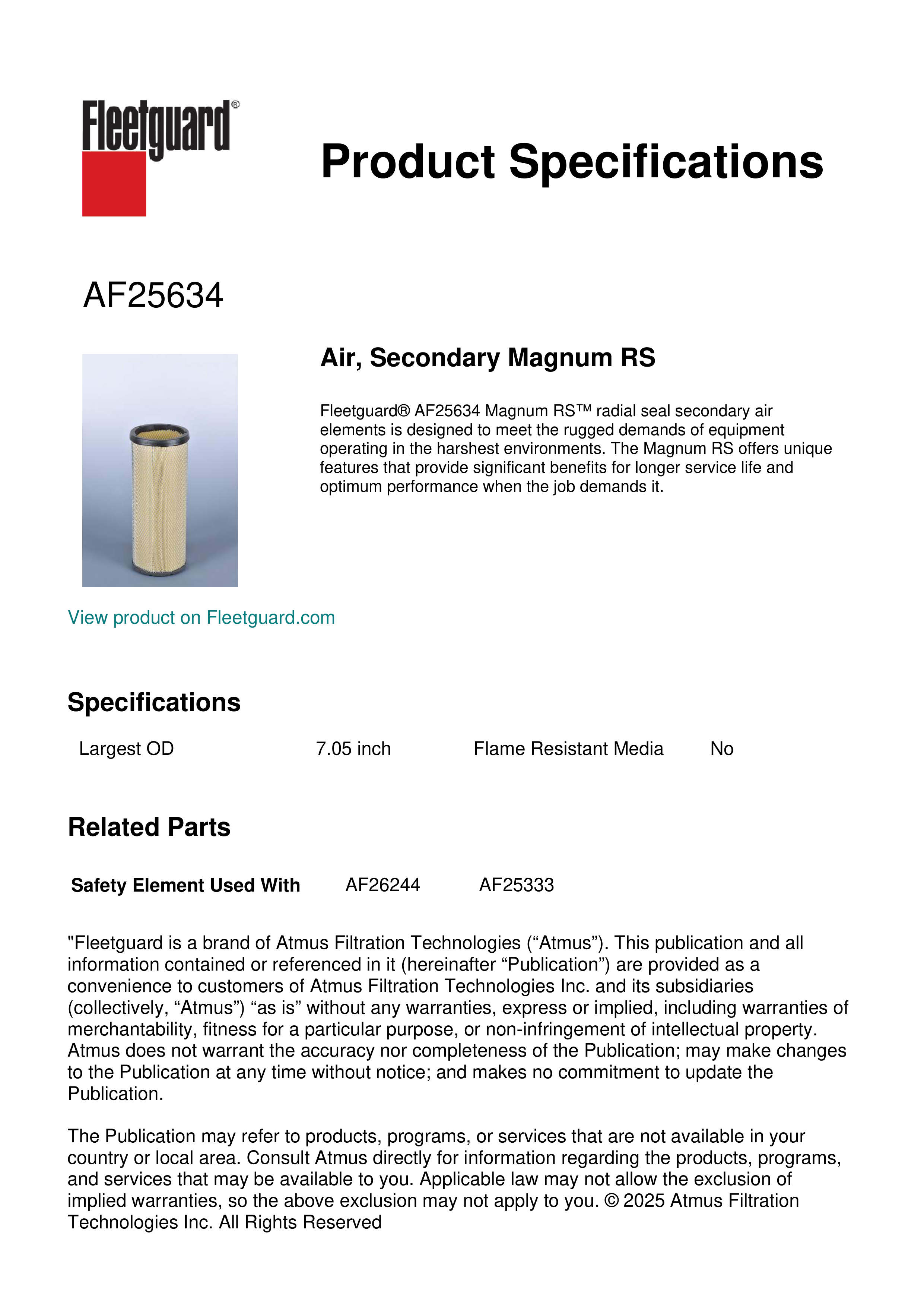 Fleetguard® AF25634 Magnum RS™ radial seal secondary air elements is designed to meet the rugged demands of equipment operating in the harshest environments. The Magnum RS offers unique features that provide significant benefits for longer service life and optimum performance when the job demands it.Specification