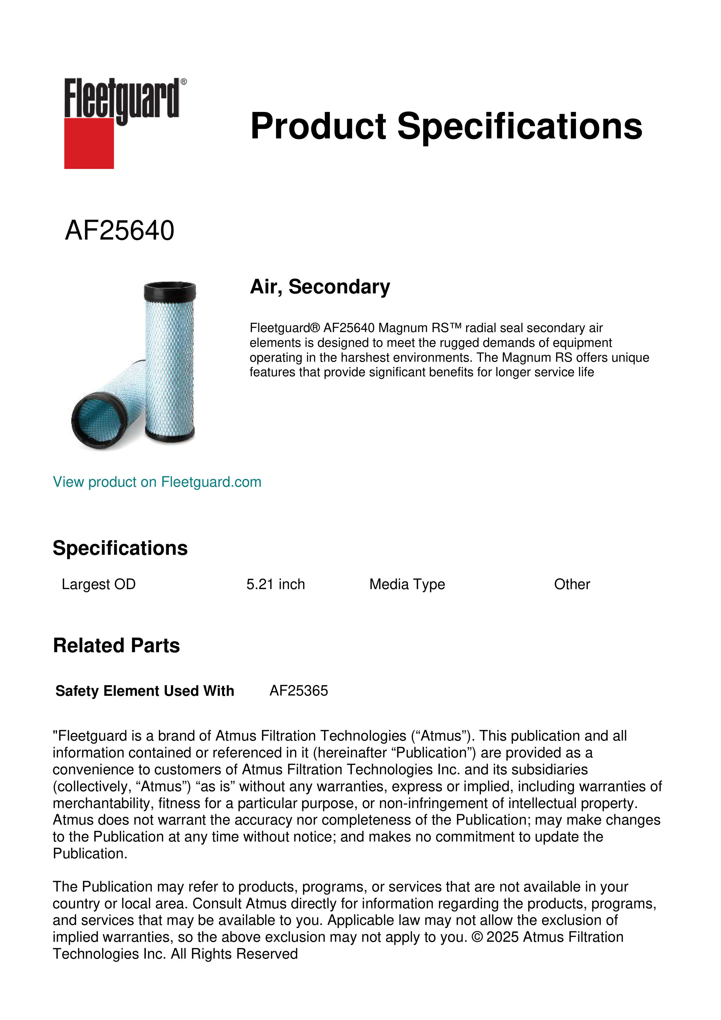 Fleetguard® AF25640 Magnum RS™ radial seal secondary air elements is designed to meet the rugged demands of equipment operating in the harshest environments. The Magnum RS offers unique features that provide significant benefits for longer service lifeSpecification