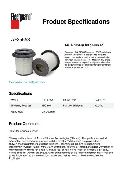 Fleetguard® AF25653 Magnum RS™ radial seal primary air element is designed to meet the rugged demands of equipment operating in the harshest environments. The Magnum RS offers unique features that provide significant benefits for longer service life and optimum performance when the job demands it.