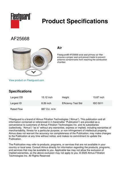 Fleetguard® AF25668 axial seal primary air filter ensures a proper seal and prevent leaks to prevent airborne contaminants from reaching the combustion chamber.