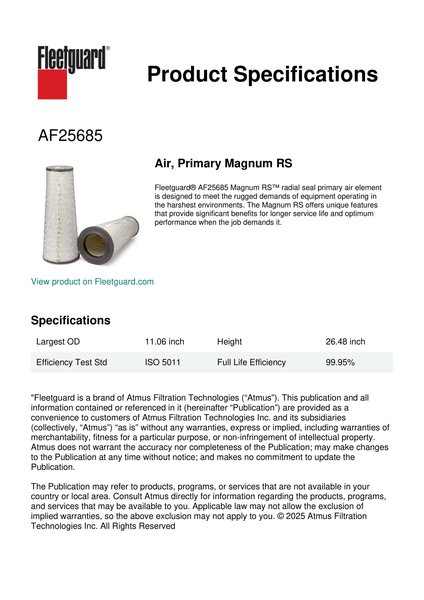 Fleetguard® AF25685 Magnum RS™ radial seal primary air element is designed to meet the rugged demands of equipment operating in the harshest environments. The Magnum RS offers unique features that provide significant benefits for longer service life and optimum performance when the job demands it.