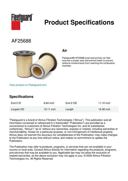 Fleetguard® AF25688 axial seal primary air filter ensures a proper seal and prevent leaks to prevent airborne contaminants from reaching the combustion chamber.