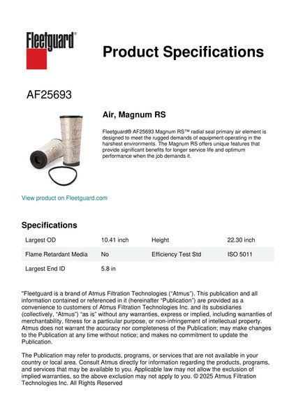 Fleetguard® AF25693 Magnum RS™ radial seal primary air element is designed to meet the rugged demands of equipment operating in the harshest environments. The Magnum RS offers unique features that provide significant benefits for longer service life and optimum performance when the job demands it.Specification