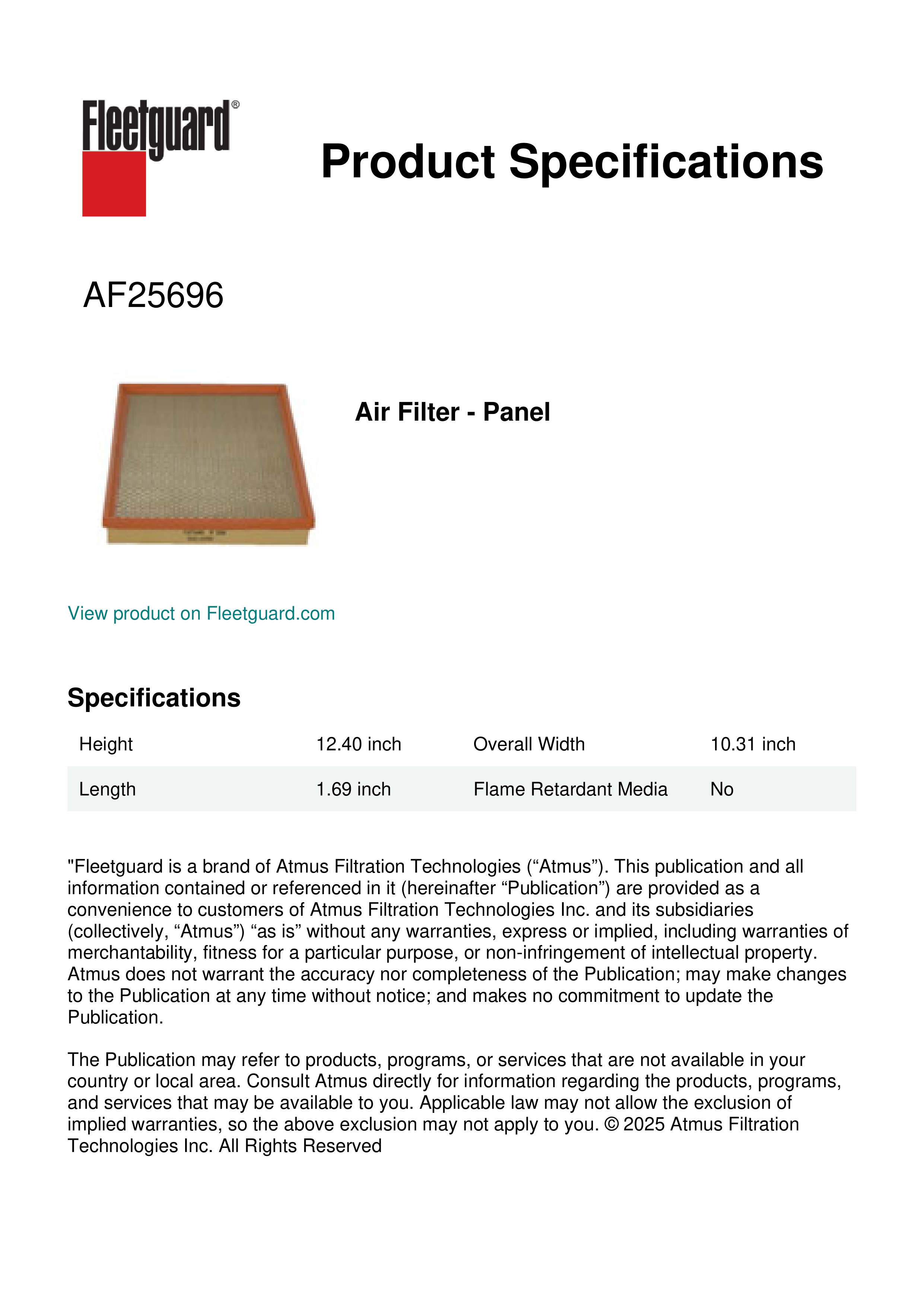 Fleetguard® AF25696 spin-on lube filter meets or exceeds OE performance requirements and the new challenges of modern engine technology.Specification