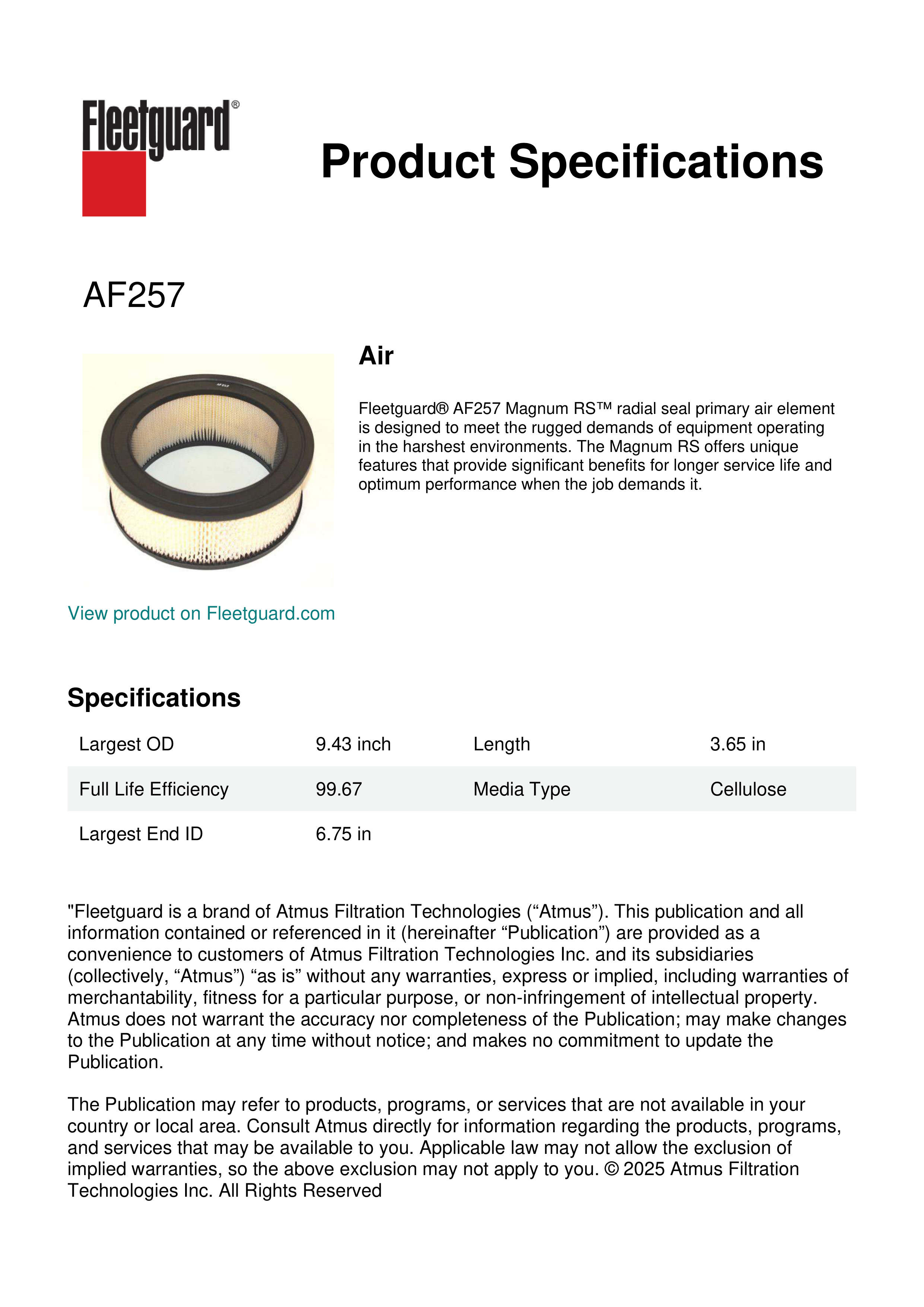 Fleetguard® AF257 Magnum RS™ radial seal primary air element is designed to meet the rugged demands of equipment operating in the harshest environments. The Magnum RS offers unique features that provide significant benefits for longer service life and optimum performance when the job demands it.Specification