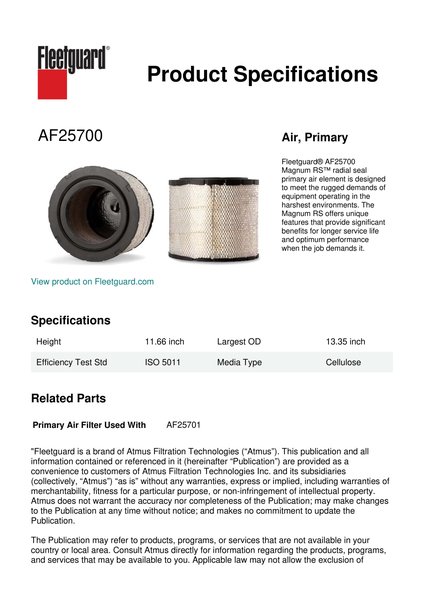 Fleetguard® AF25700 Magnum RS™ radial seal primary air element is designed to meet the rugged demands of equipment operating in the harshest environments. The Magnum RS offers unique features that provide significant benefits for longer service life and optimum performance when the job demands it.Specification
